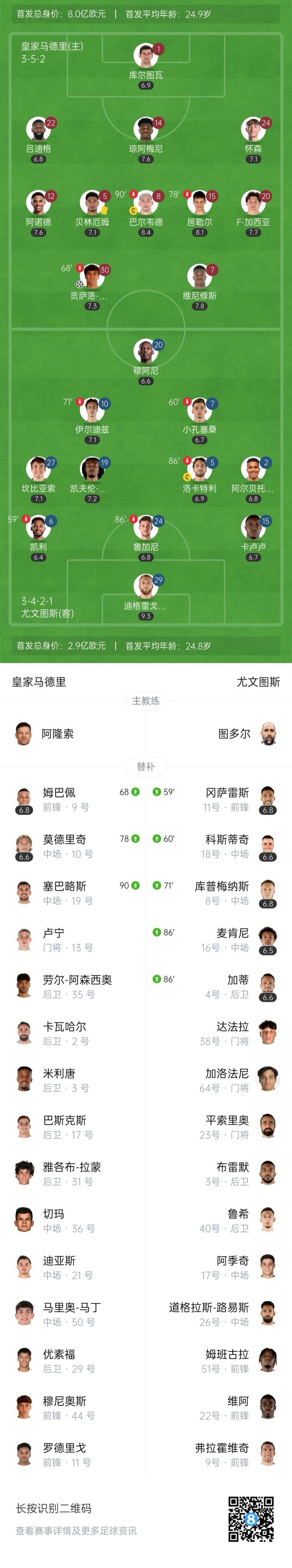姆巴佩和莫德里奇坐镇替补席。↓